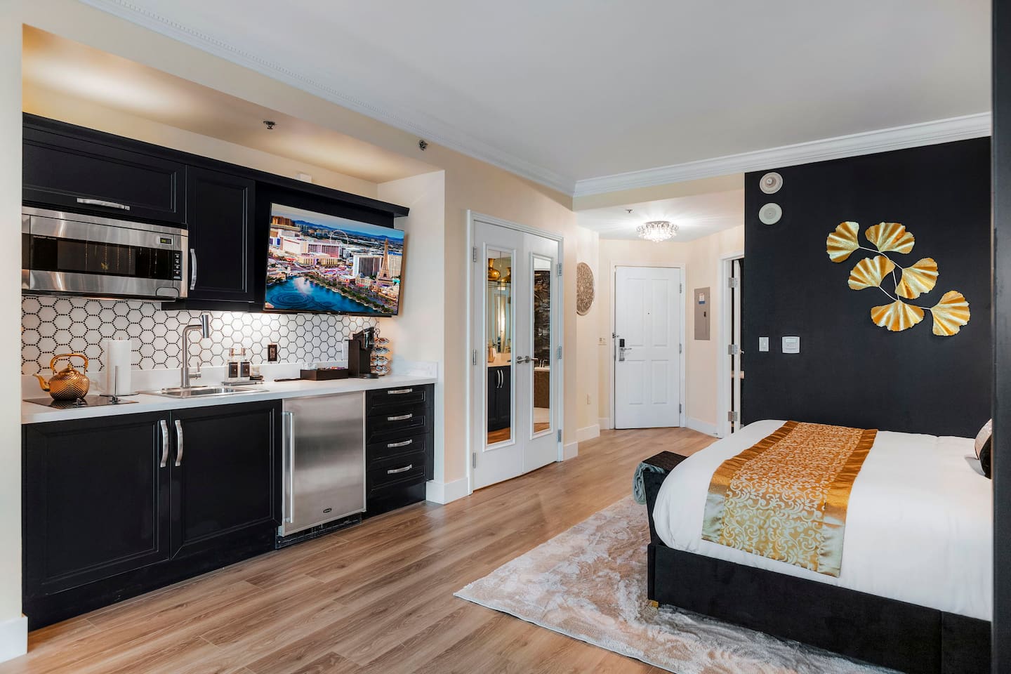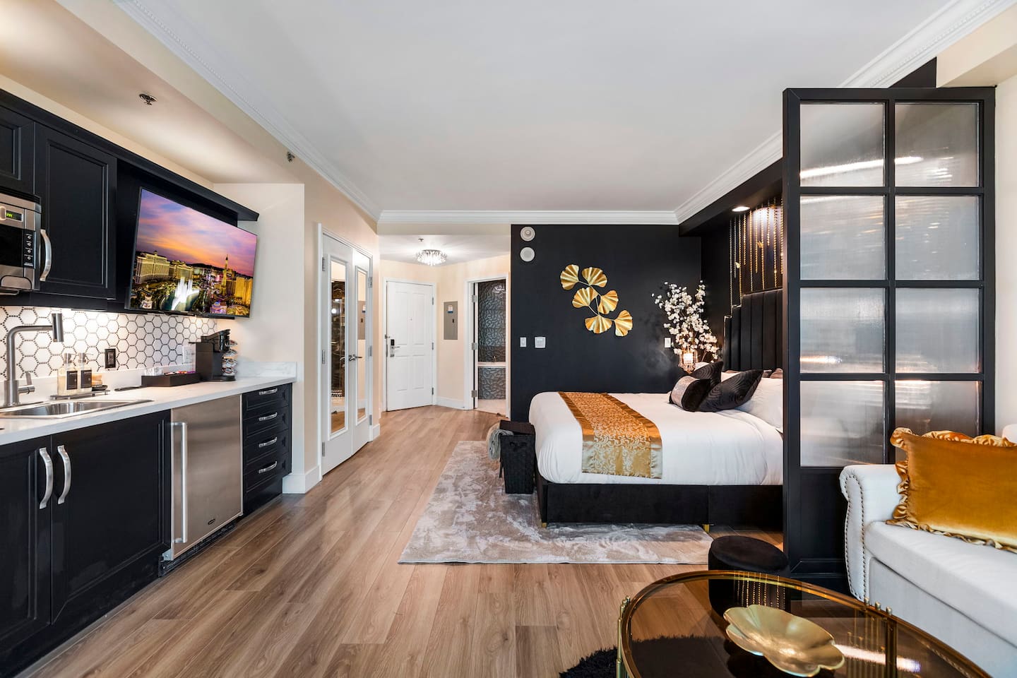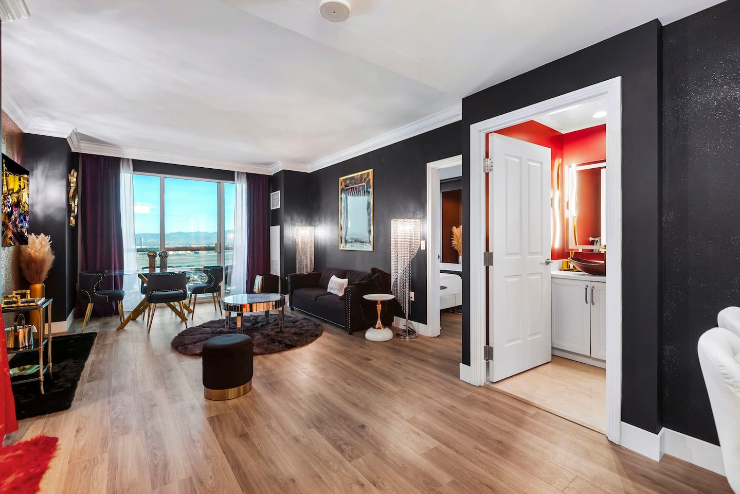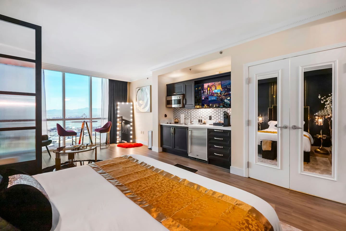 REMODELED * Free Access to ALL MGM Amenities ( Lazy River/Gym/4 Pools ) * Strip View Balcony * Jacuzzi Tubs * LED Lighting * 2 King Beds Total – 1 in Each Suite * 2 Pull-Out Queen Beds Total – 1 in Each Suite * 1 Fully Equipped Kitchen + Living Room * 1 Fully Equipped Kitchenette + Living Room * 3 Full Bathrooms * Free Valet Parking for 2 Vehicles NO RESORTS FEE