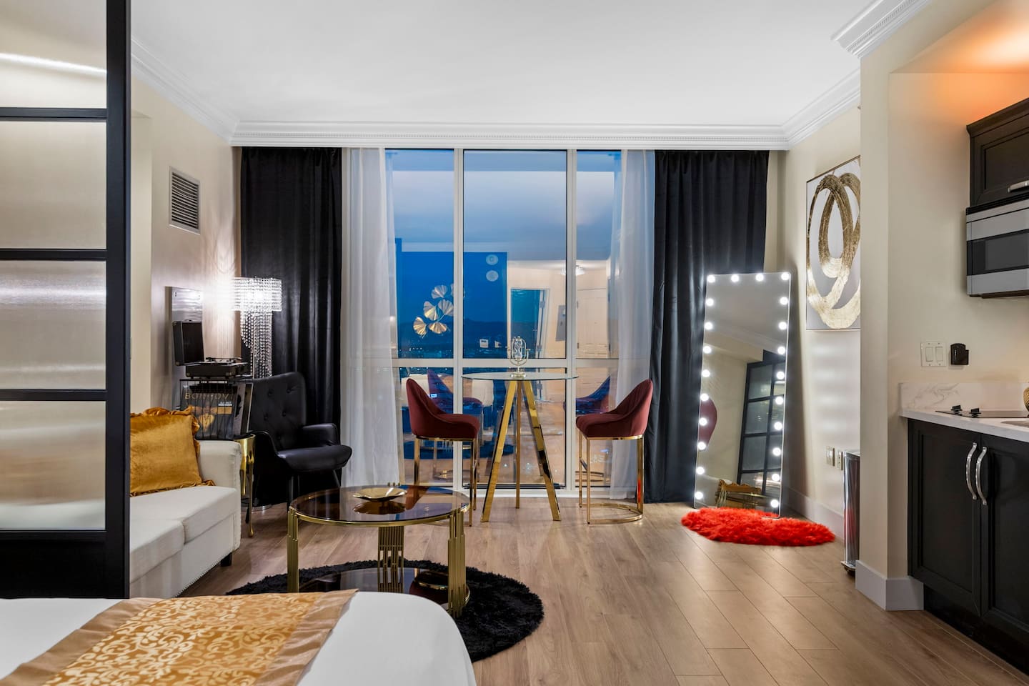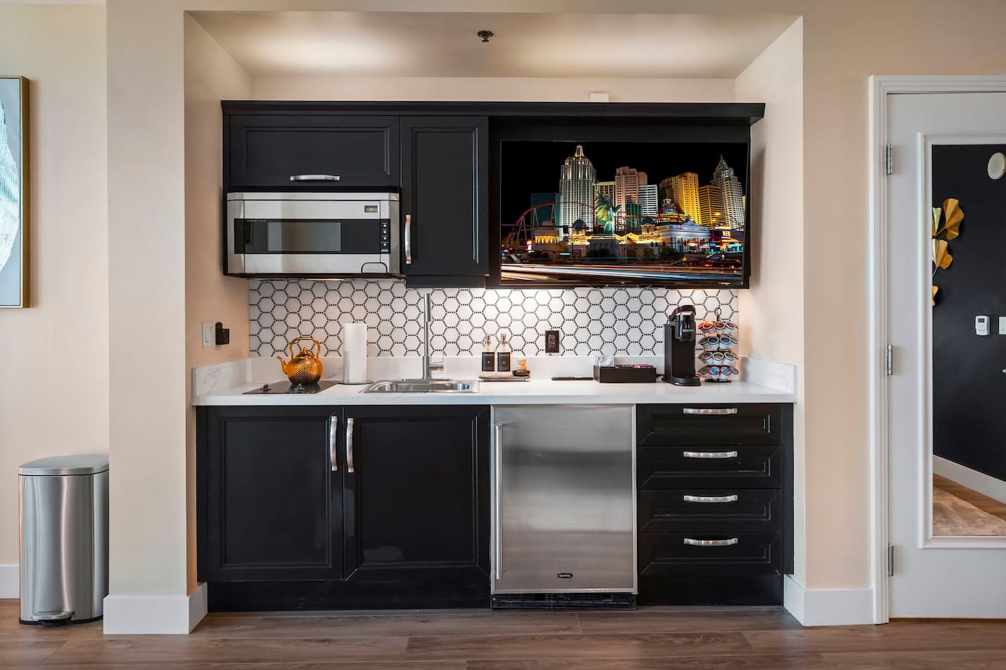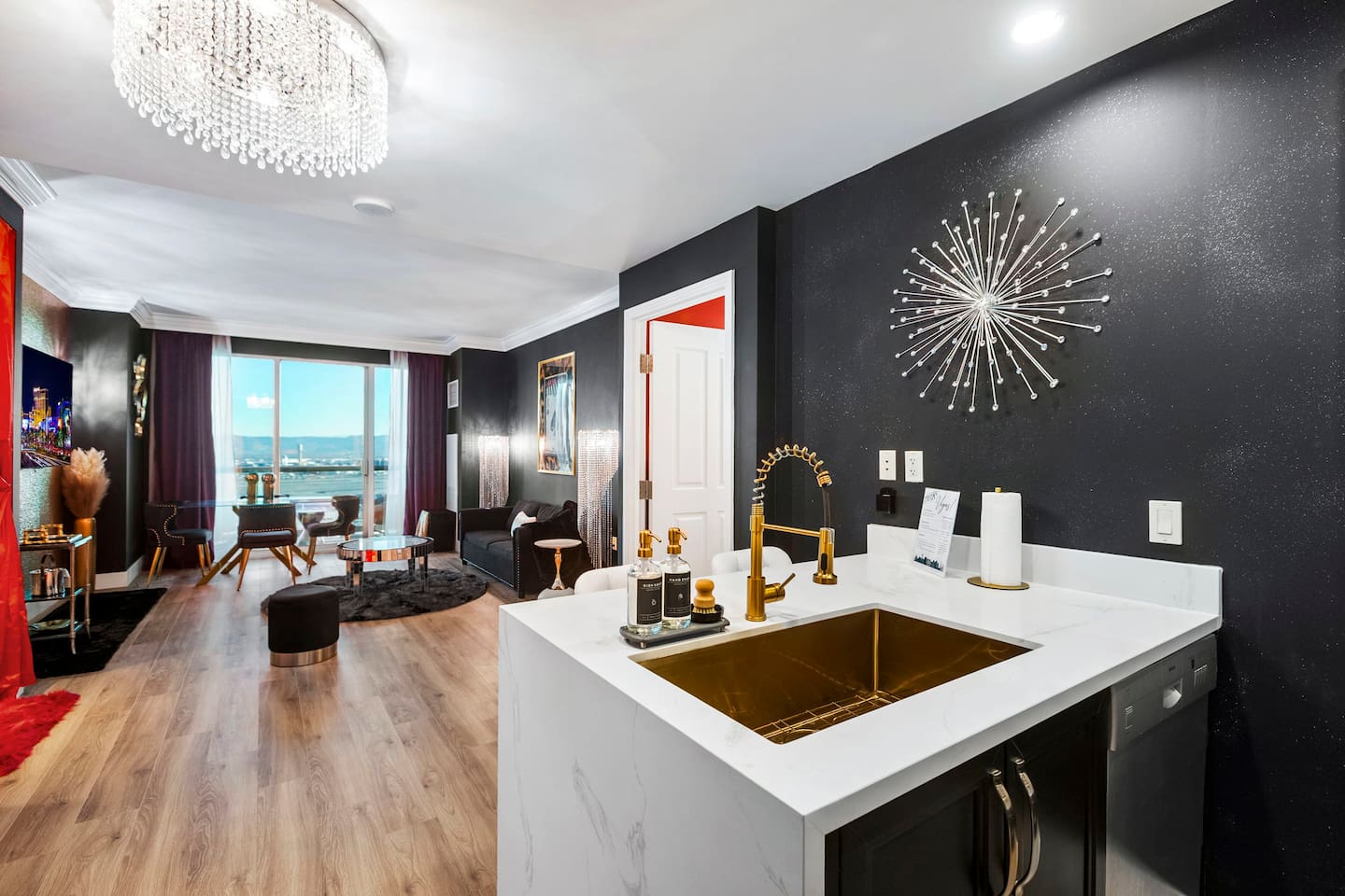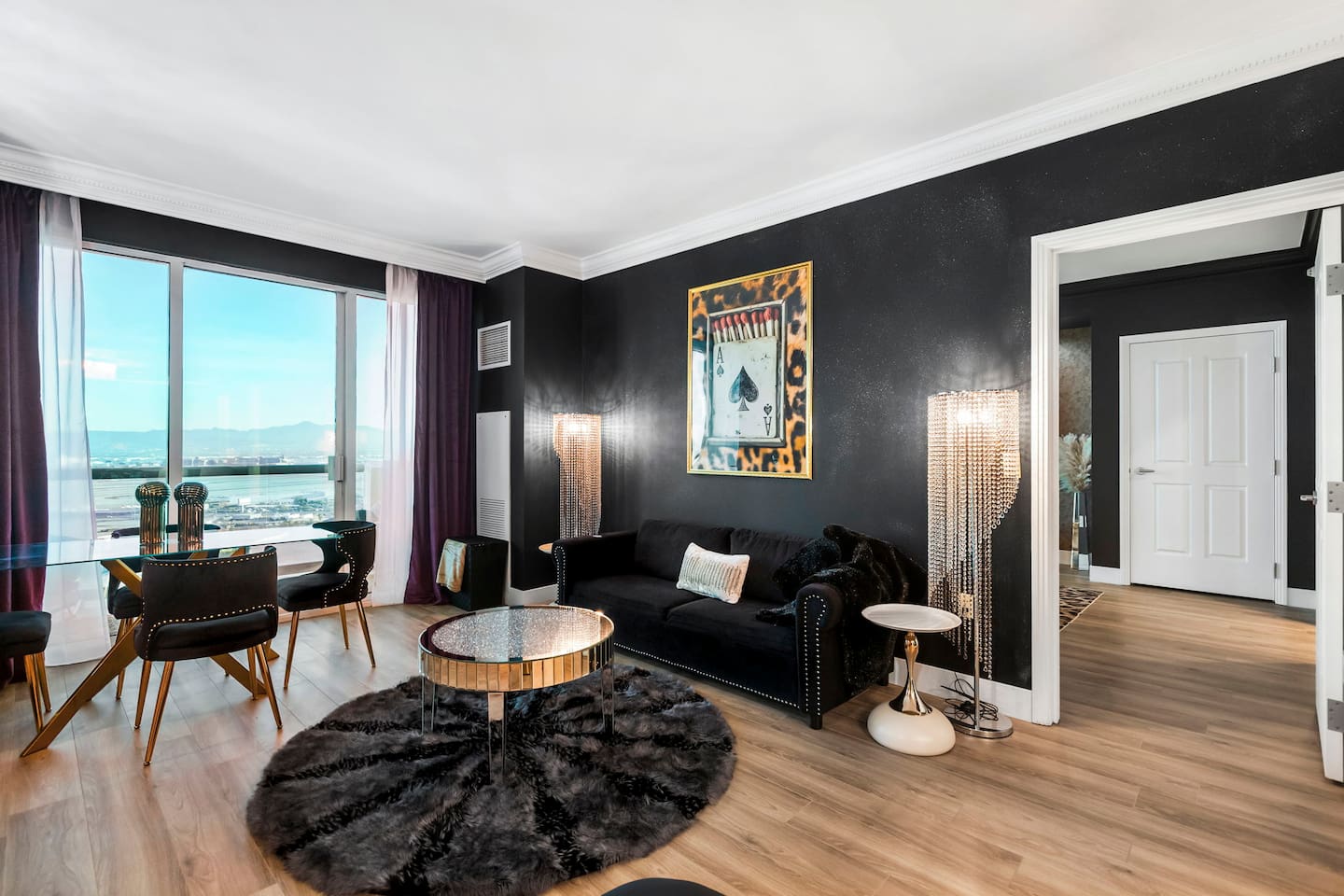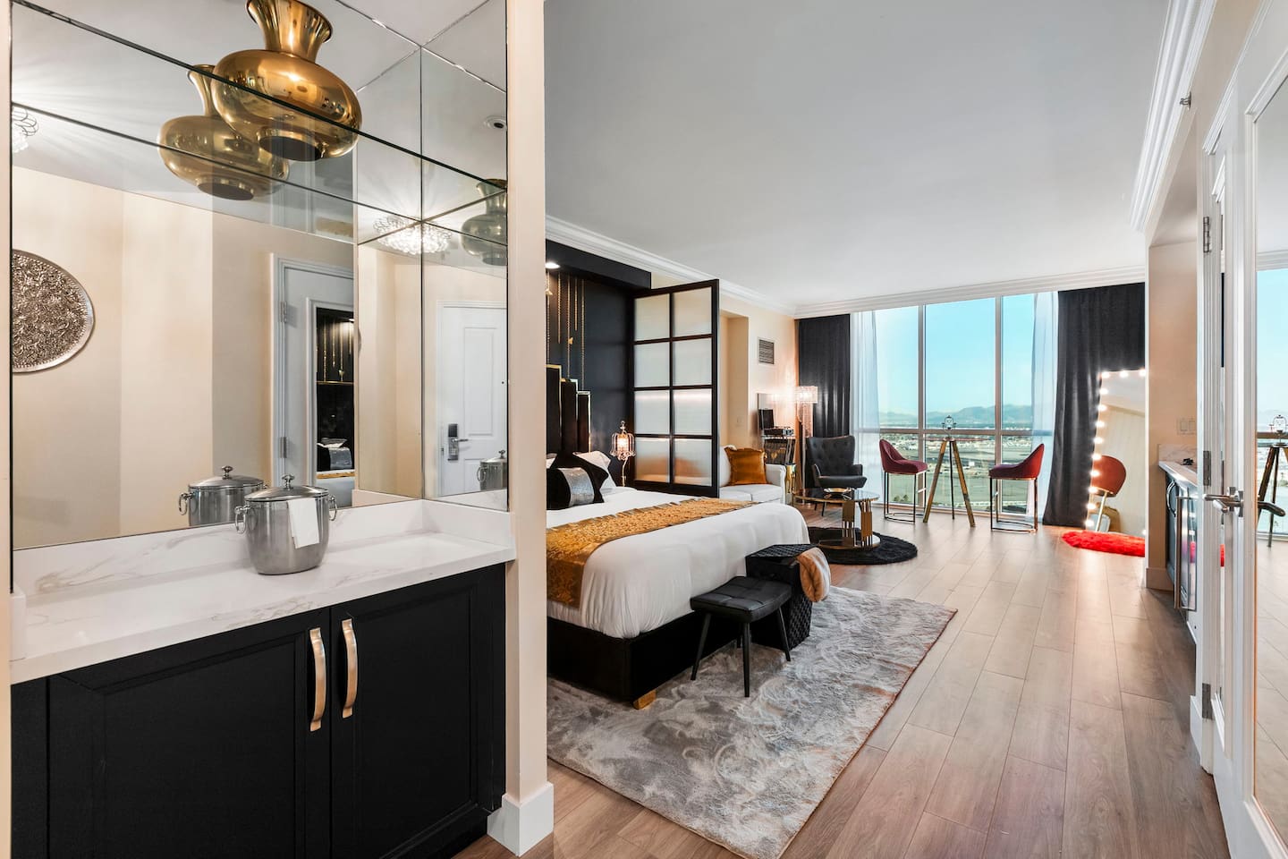 REMODELED * Free Access to ALL MGM Amenities ( Lazy River/Gym/4 Pools ) * Strip View Balcony * Jacuzzi Tubs * LED Lighting * 2 King Beds Total – 1 in Each Suite * 2 Pull-Out Queen Beds Total – 1 in Each Suite * 1 Fully Equipped Kitchen + Living Room * 1 Fully Equipped Kitchenette + Living Room * 3 Full Bathrooms * Free Valet Parking for 2 Vehicles NO RESORTS FEE