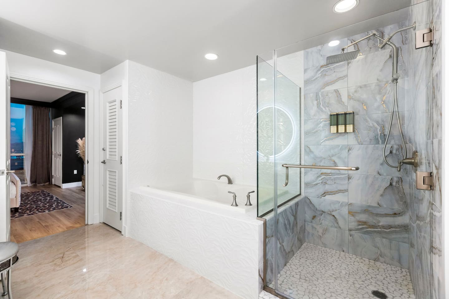 Welcome to our luxurious penthouse on the 22nd floor of the Signature MGM, recently remodeled with $100,000 in upgrades. - This Suite is in Tower 2 ( Tower A/B/C = 1/2/3 ) * 2 Separate Condos Side by Side ( Adjoined by Double Doors ) One Side is a 1 Bedroom Condo - The Other Side is a Studio Condo Both Condos are Joined Together by Double Doors that can Close/Open/Lock This Allows for the Option to enjoy 3 Private Sleeping Areas Or Open.